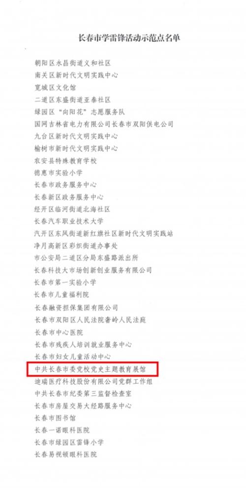 近日,中共長春市委黨校(長春市行政學院)黨史主題教育展館被命名為長春市學雷鋒活動示范點。 長春市學雷鋒活動示范點由中共長春市委宣傳部組織評選,持續深入推進學雷鋒活動,讓雷鋒精神在新時代綻放更加璀璨的光芒,命名了33個單位為“長春市學雷鋒活動示范點”。 中共長春市委黨校(長…