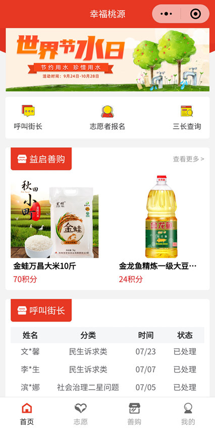 “群眾還可以在‘幸福桃源’小程序還呼叫街長,查詢單元長、樓棟長、網格長,發布心愿和問題。志愿者看到心愿并認領后可獲得相應積分,積分可以兌換生活用品;問題接單后將進行分類處理,確保24小時內給群眾反饋!壁w南介紹,“幸福桃源小程序”上動動手指、拍段視頻,就能解決居民身邊的問題,黨群關系也逐漸“升溫”。
