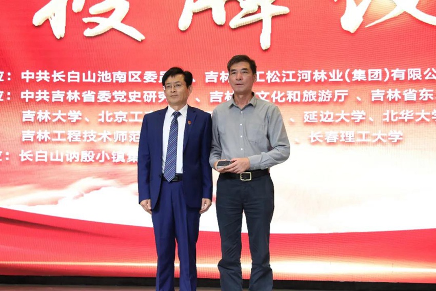 池南區副區長馮起翔向楊靖宇將軍次孫、長白山老黑河遺址紅色文化宣傳大使馬繼志贈送歌曲《楊靖宇之歌》。長白山池南區委員會供圖