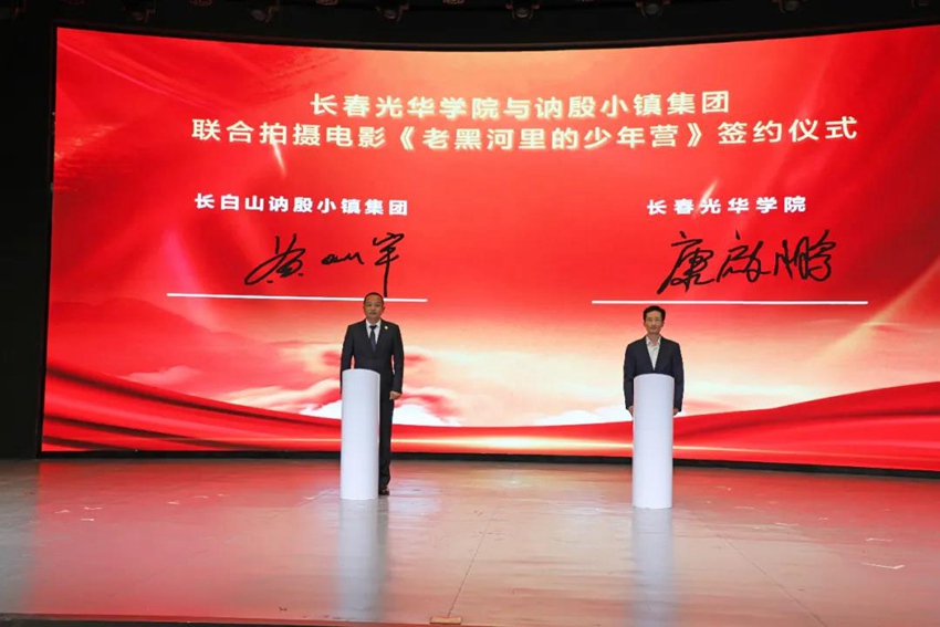 訥殷小鎮集團總裁黃燦宇與長春光華學院董事長康啟鵬現場簽約聯合拍攝電影《老黑河里的少年營》。長白山池南區委員會供圖