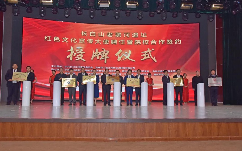 人民網長白山9月19日電 (李思玥)17日下午,長白山老黑河遺址紅色文化宣傳大使聘任暨院校合作簽約授牌儀式在長白山池南區訥殷演藝中心舉行。