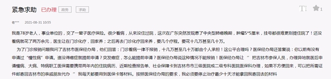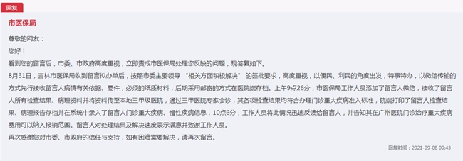 收到留言后,吉林市委、市政府立即責成市醫保局處理問題。吉林市醫保局9月8日回復稱:“從便民、利民的角度出發,特事特辦,將以微信傳輸的方式先行接收留言人病情有關依據、要件,必須的紙質材料后期采用郵寄的方式在醫院端存檔。上午9時26分,市醫保局工作人員添加了留言人微信,接收了留言人所有檢查結果、病理資料并將資料傳至本地三甲級醫院,通過三甲醫院專家會診,其各項檢查結果均符合辦理門診重大疾病準入標準,院端打印了留言人檢查結果、病理報告存檔并在系統中錄入了留言人門診重大疾病、慢性疾病信息。上午10時6分,工作人員將此情況迅速反饋給留言人,并告知其在廣州醫院門診治療重大疾病費用可以納入報銷范圍。留言人對處理結果及解決速度表示滿意并致謝工作人員!