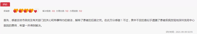 “感謝吉林市政府及有關部門的關心和特事特辦的做法,解除了患者的后顧之憂。在此萬分感謝!”小留言反映大民生,政府為群眾辦實事的態度贏得網友的“五心好評”。