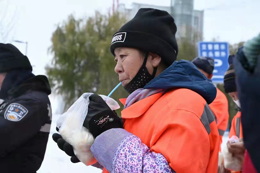 松原、長春、嶺城志愿者三城齊行動為環衛工人送去冬日早餐(長春城市管理局供圖)