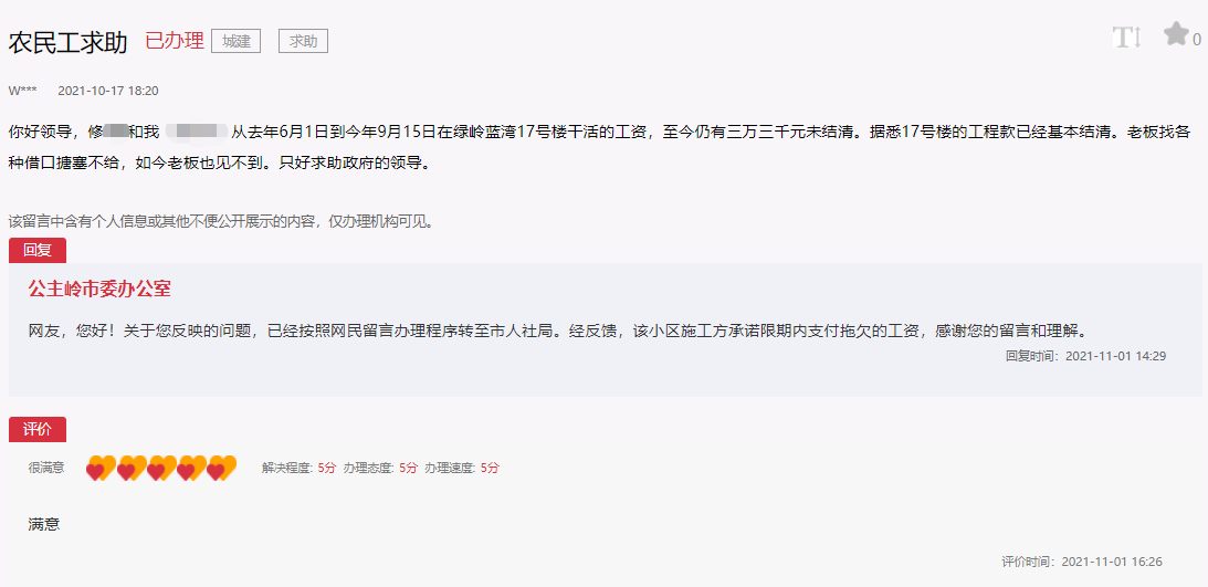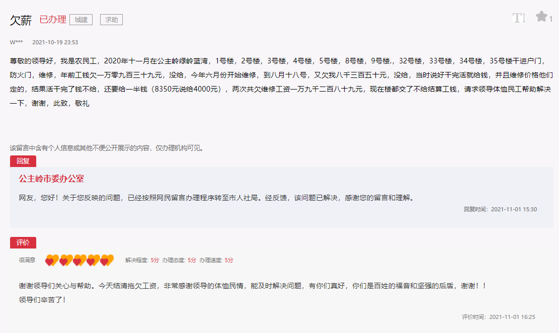 11月1日,公主嶺市委辦公室回復網友留言,“您好!關于您反映的問題,已經按照網民留言辦理程序轉至市人社局。經反饋,該問題已解決,感謝您的留言和理解!苯浌鲙X市人社局協調,網友拿回了被拖欠的工資。