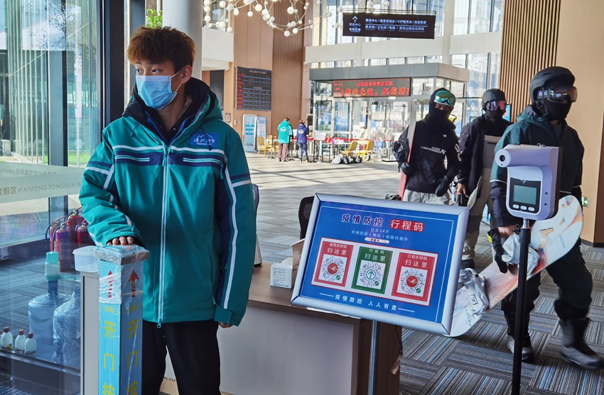 出入口實行電子體溫監測,安全碼、行程碼掃碼入場,防疫志愿者提示游客佩戴口罩……滑雪場嚴格按照政府疫情防控和滑雪安全引導要求,通過雪上巡邏隊和防疫志愿者等工作組,落實安全保障、車輛管控等工作,提高游客安全意識。