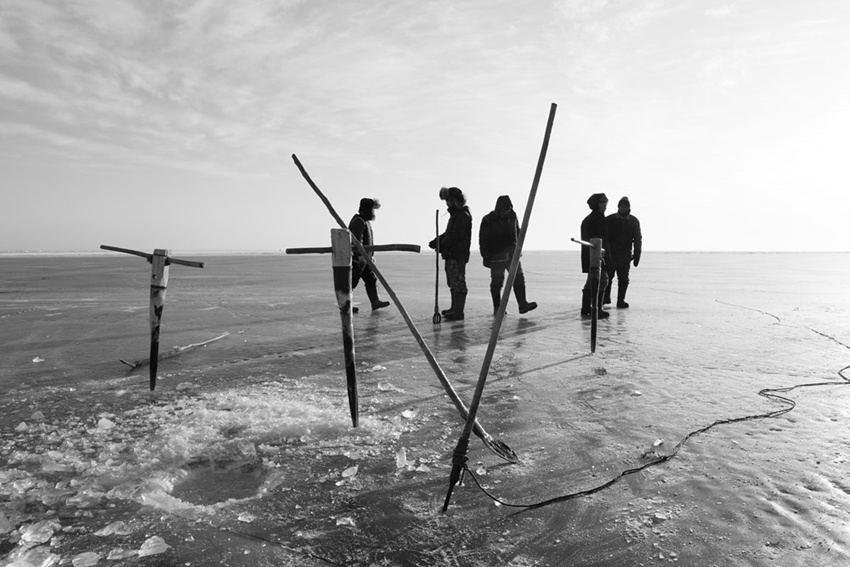到達預期地點,張文和漁工們迅速進入工作狀態。識冰、镩冰、布網、出網,這是冬捕的四個關鍵環節。