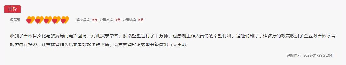 “收到了吉林省文化與旅游廳的電話回訪,對此深表榮幸,談話整整進行了十分鐘!1月29日,該網友再次留言并給出“五心好評”。網友表示,感謝工作人員們的辛勤付出,是他們制訂了諸多好的政策吸引了企業對吉林冰雪旅游進行投資,讓吉林省能夠進步飛速,為吉林省經濟轉型升級做出巨大貢獻。