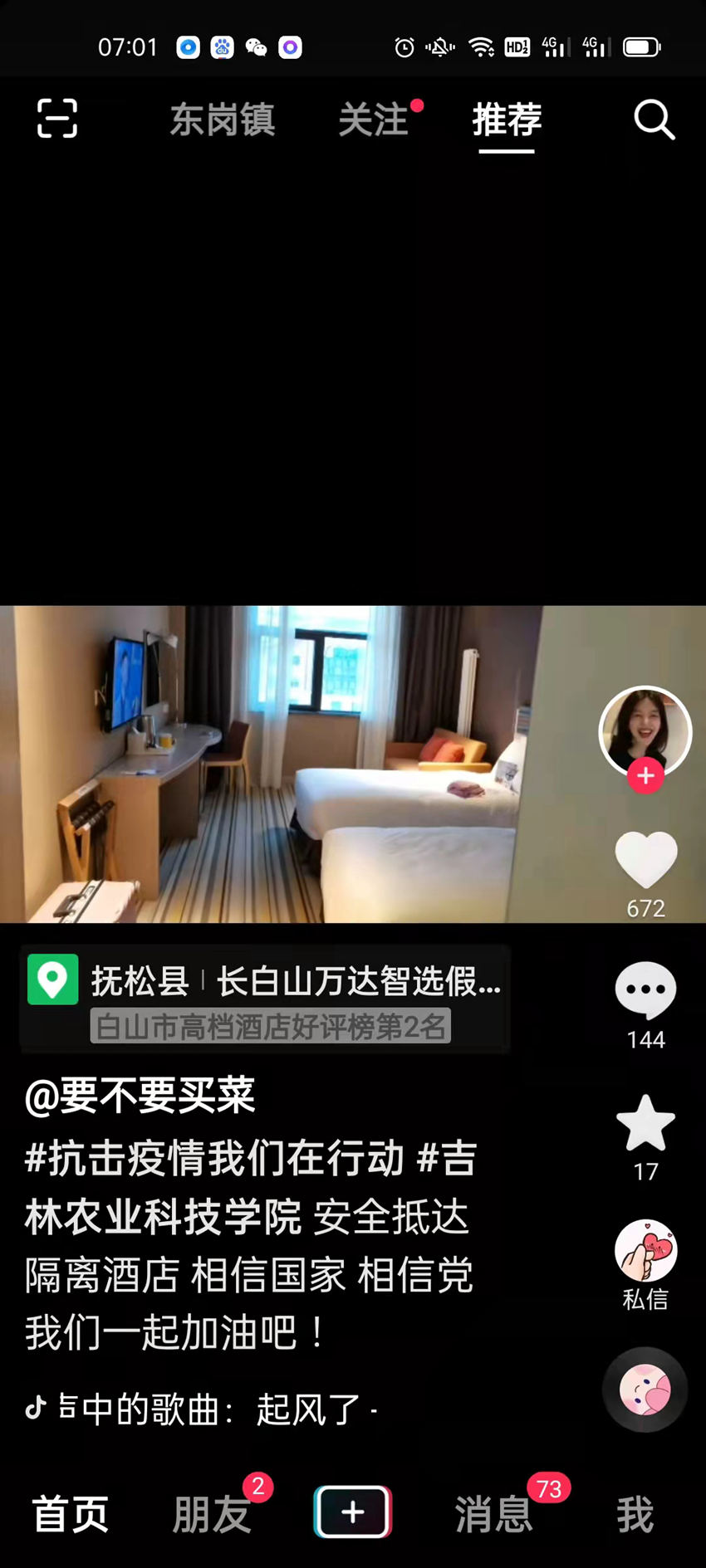 “出發前,學校給我們每個人發了防護服,到達隔離酒店后,工作人員已經為我們做好了熱乎乎的飯菜!蹦壳罢陂L白山保護開發區隔離的吉林農業科技學院學生黨思琦感到很欣慰!斑M到房間,酒店已經準備好了飲用水、衛生紙、洗漱用品等,還有給我們的一封信和一個玩偶,還有中藥和小零食!