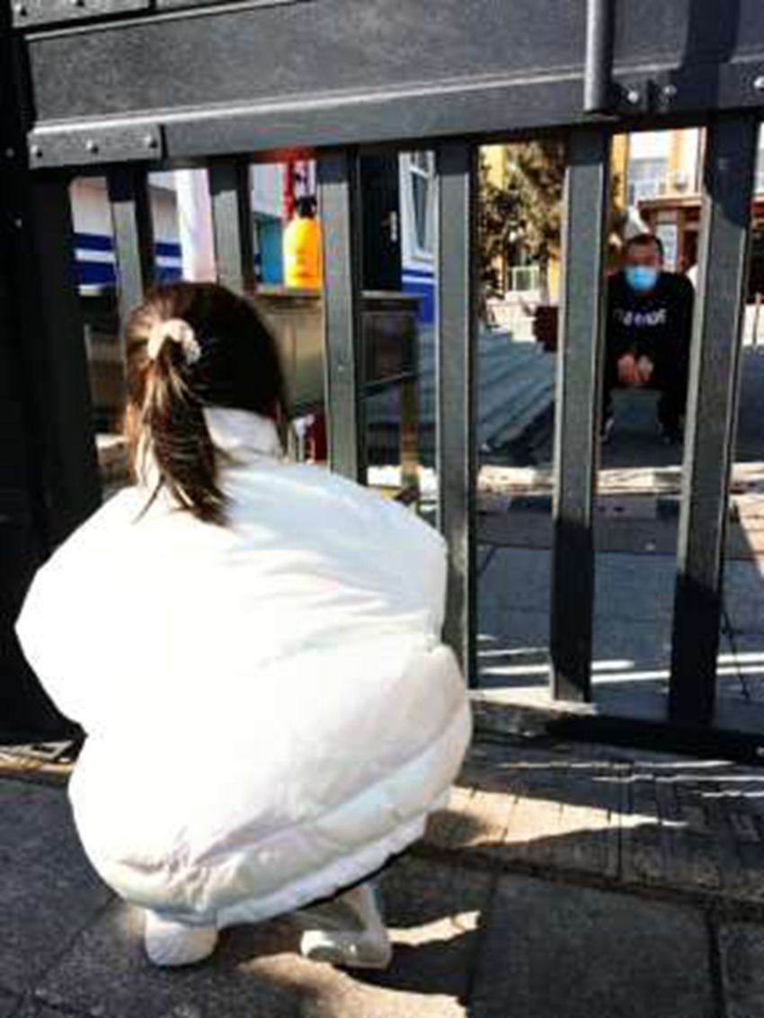 這是物理與電子信息學院黨總支副書記于健的妻子在校園外拍攝的一張照片,那時候的白城市還未實施靜態管理,思念爸爸的女兒苦苦央求媽媽帶她看看爸爸,蹲在校園圍欄外的小小背影,因為防疫規定只能遠遠安慰女兒的爸爸,此時按下手機快門的媽媽,心中的酸楚思念是不是還未來得及表達?觸手可及的照顧關愛都留給了學生,待疫情結束再給家人一個大大的擁抱吧。