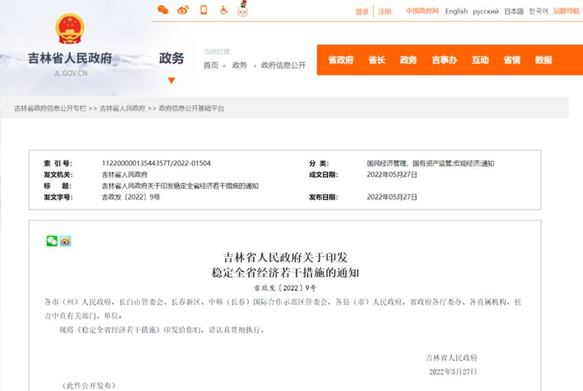 吉林省人民政府關于印發穩定全省經濟若干措施的通知