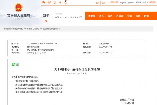 免去解樹森的省吉盛資產管理有限責任公司總經理職務。
