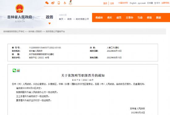 張凱明晉升為省人民政府辦公廳一級巡視員;