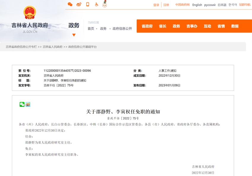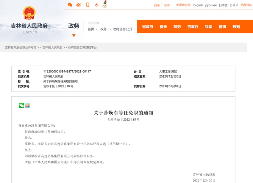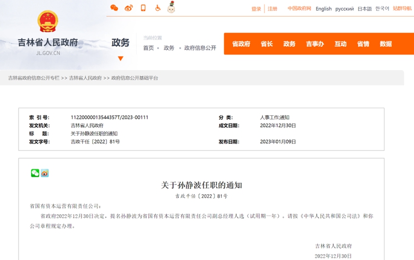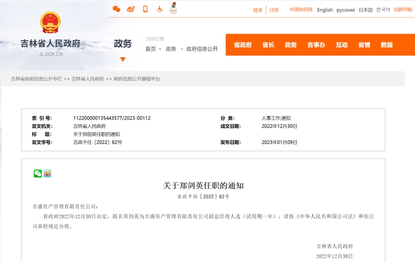 省政府2022年12月30日決定,任命劉威、剛輝為長影集團有限責任公司副總經理(試用期一年)。