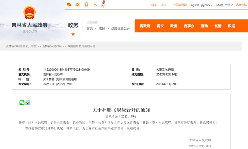 省政府2022年12月30日決定,林鵬飛晉升為長春市社會保險事業管理局一級巡視員。