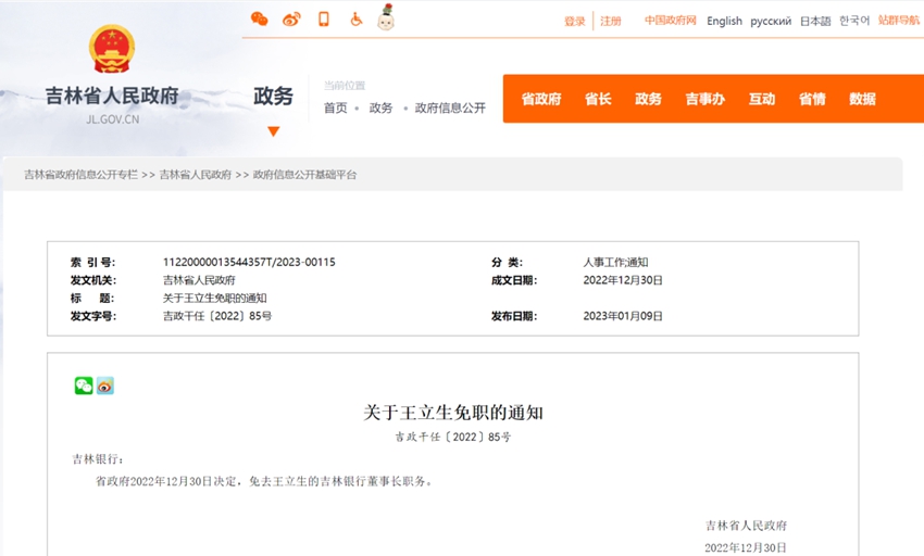 省政府2022年12月30日決定,免去王立生的吉林銀行董事長職務。