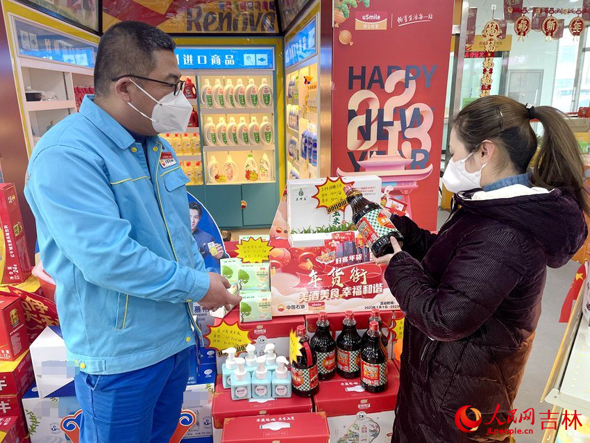 站經理李朋在便利店為顧客介紹商品。人民網 李思玥攝