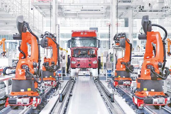 智能制造是先進制造技術和新一代信息技術的深度融合,是我國制造業高質量發展的主要方向。圖為2023年1月31日,工人在位于吉林長春的一汽解放J7智能工廠內進行整車裝配作業。 新華社記者 許暢/攝