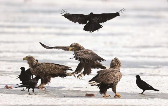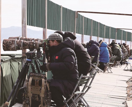 連日來,琿春市敬信濕地龍山湖水庫迎來數百只猛禽駐足覓食,虎頭海雕、白尾海雕、禿鷲、海鷗等稀有猛禽爭相亮相、盤旋搏擊,吸引了全國各地百余名攝影愛好者前來拍攝,記錄這難得的精彩瞬間。(記者傅多強 曹夢南攝)