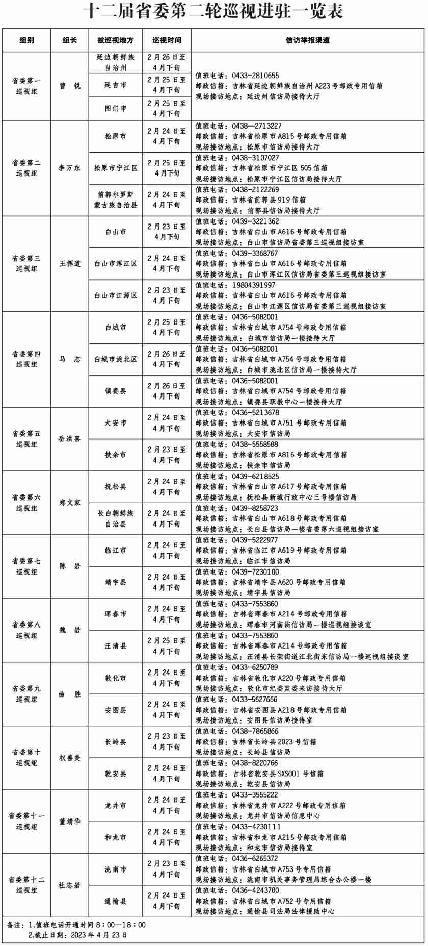據悉,12個省委巡視組將在被巡視地方工作60天左右,期間設立專門值班電話、郵政信箱和現場接訪地點,主要受理反映被巡視地方黨委和人大常委會、政府、政協黨組班子成員,以及其他省管干部、下一級主要負責人的來信來電來訪,重點是關于違反政治紀律、中央八項規定精神、組織紀律、廉潔紀律、群眾紀律、工作紀律、生活紀律等方面的突出問題。巡視組受理信訪時間截止到2023年4月23日。(記者趙夢卓)