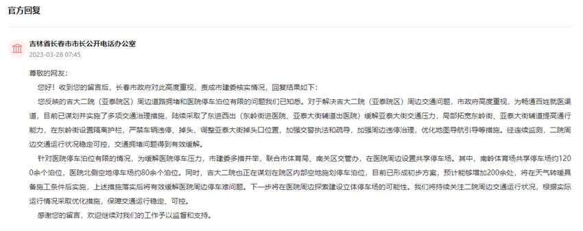 此外,據長春市市長公開電話辦公室回復稱:“吉大二院也正在謀劃在院區內部空地施劃停車泊位,目前已形成初步方案,預計能夠增加200余處,將在天氣轉暖具備施工條件后實施,上述措施落實后將有效緩解醫院周邊停車難問題?!?/p>