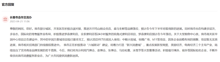針對網友提出的引進其他首店品牌的建議,長春市合作交流辦公室表示:“我市部分城區、開發區在積極洽談對接,推進沃爾瑪山姆會員店、盒馬生鮮等品牌落位,預計在今年下半年將取得新的進展。同時我市也在構建多層次、多業態、國際化的零售服務業布局,積極推進羅森便利店、全家便利店等24小時服務的街角式便利店項目,羅森便利店預計在今年落位?!?/p>
