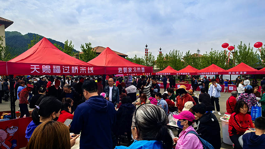 本次活動現場還設置了農副產品銷售、非遺文創品展銷、山野菜美食廣場、鄉村小集市、網紅打卡等區域。山野菜包子、九臺燒烤、九臺熱面、烤全羊、鹵味熟食、特色小吃、精美甜品,一應俱全。本土味十足的鄉村小集市熱鬧非凡,商品琳瑯滿目,充滿農村特色。三處網紅打卡區域,分別以油紙傘、風車、燈籠為主題,吸引游客打卡拍照。美食節作為惠民樂民的九臺品牌節慶活動,今年推出多項惠民措施?;顒蝇F場,免費吃包子、免費吃肉串、七折吃肉串活動,吸引眾多游客參與?;顒悠陂g,多家鄉村旅游景點推出優惠酬賓活動。據了解,當地山野菜包子這一美食品牌已打響,如美鄉村包裝的“望山潮品”(當地農副產品、玉米、年豬肉、干果、山菜)更成為鄉村旅游熱銷商品。馬鞍山村的旅游元素眾多,又是多屆山野菜美食節舉辦地,吸引游客趨之若鶩。預計今年活動期間將有6—10萬人參與,美食一項收入可達500萬元左右,旅游收入及帶動相關產業收入可達3000萬元以上。