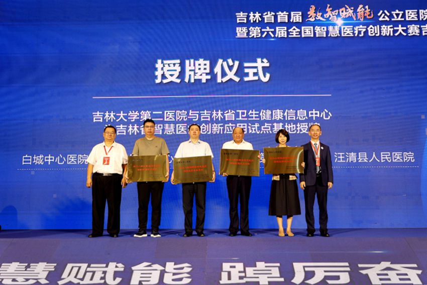 會議現場為白城中心醫院、松原市中心醫院、通榆縣第一醫院、汪清縣人民醫院授予“吉林省智慧醫療創新應用試點基地”牌匾。