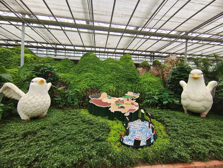 進入“強國之路”展廳,“以中國式現代化全面推進中華民族偉大復興”幾個大字為整個展館奠定了主基調。今年,新時代創意展廳主題為“強國之路”,主要以黨的二十大精神為主要展示內容,展示我國過去十年取得的成就。進入到展廳內部,“偉大變革”“全面建成小康社會”“美麗中國”等關鍵字和綠植農作物組成的景觀顯示著國家的強大,“青春有我”“聽黨話、感黨恩、跟黨走”“堅持黨的領導”等內容穿插其中,組成共30組景觀,讓大家在游覽中了解到更多祖國的發展變化。