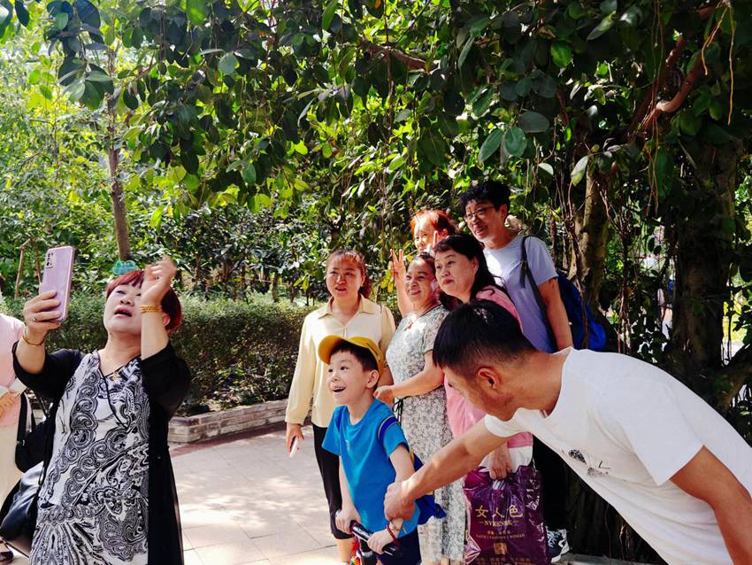 “這是什么樹呀?以前都沒見過?!庇慰蛷埌⒁毯徒忝脗兗娂娫诟黝愓湎≈参锴耙灰涣粲?,一邊拍照一邊發出贊嘆。