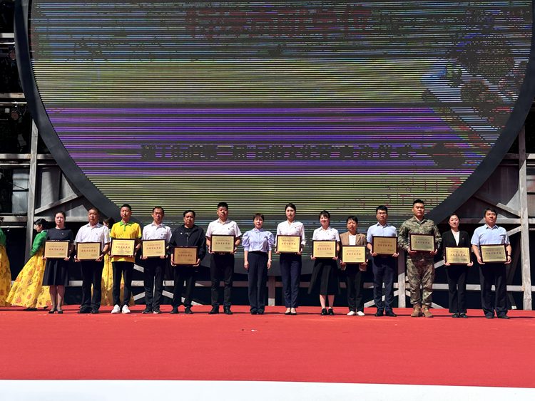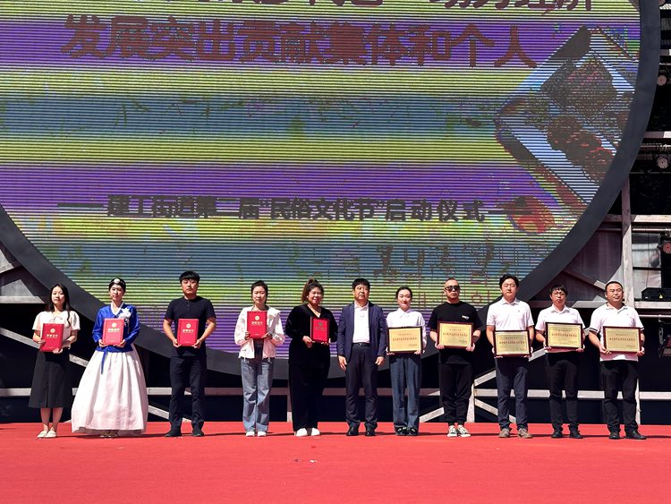陳航發為建工街道第二屆民俗文化節開幕鳴鑼。樸清梅、金時德分別為建工街道“我為綠美延吉出份力”特殊貢獻單位、“我為家鄉代言”助力經濟發展突出貢獻集體和個人頒獎,某部隊大隊教導員張賀斌為“民族團結示范家庭”代表頒獎。