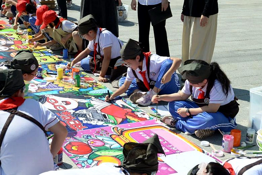 在紅旗會堂門前,200名汽開學子用畫筆描繪長春國際汽車城百米畫卷,用巧手展示國際汽車城藝術作品,用器樂演奏國際汽車城優美樂章,一幅幅現場寫生、一件件藝術作品、一曲曲器樂演奏,孩子們用自己的方式向祖國、向家鄉、向恩師表達著美好的祝福。