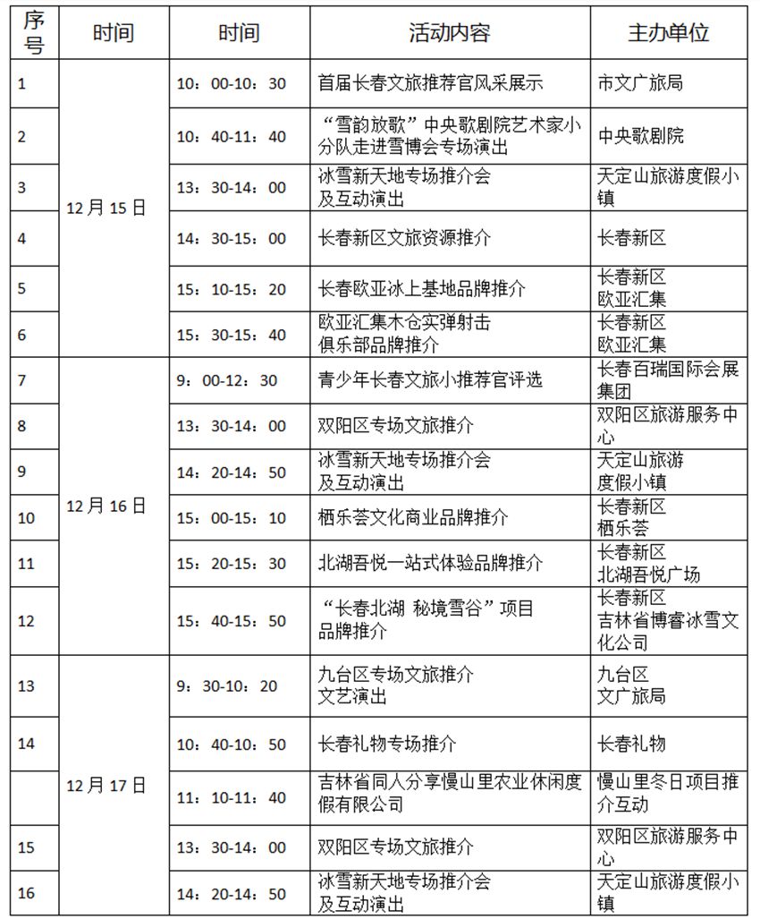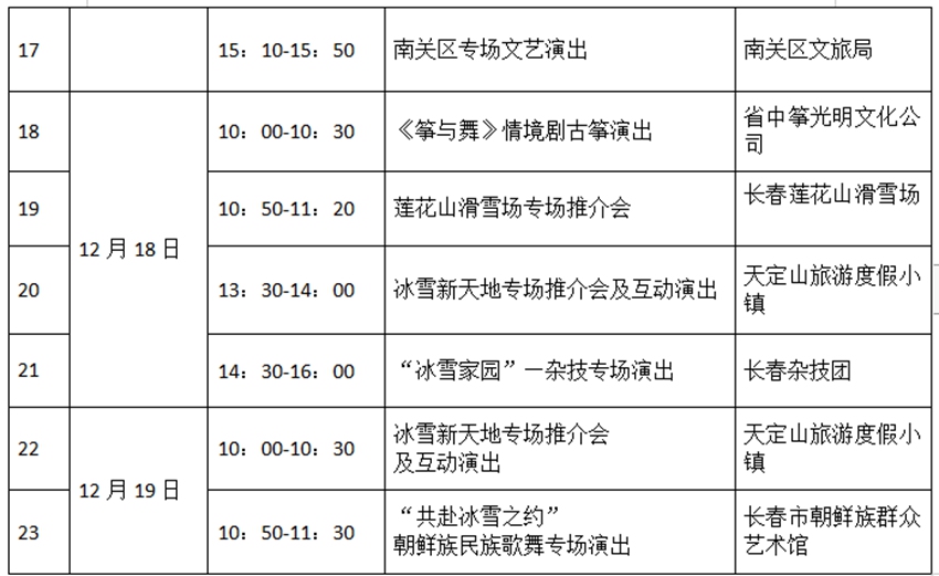 另外,12月15—19日,3號館—冰雪長春主題館各個時間段都有演出和推介活動,詳情如下: