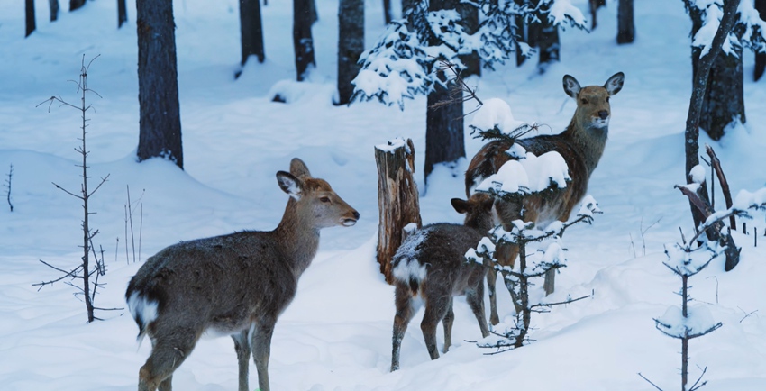 跟隨兩位主角的步伐,萬物生靈肆意奔跑,長白山的冬日美景也如畫卷一般徐徐展開。雪花滋潤大地,一朵花破土而出,人類踏上了這片雪域。