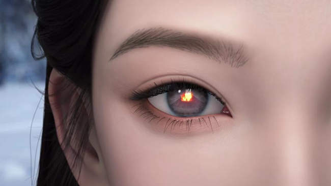 當全面展現完長白山冰雪美景之后,導演通過一個特殊轉場方式,將風景收回到女主的眼睛里。前一個段落結束,進入到下一個段落:前世今生。