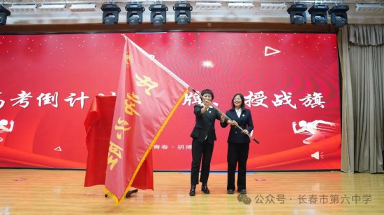 儀式上,薛紅利代表學校為高考倒計時100天揭牌并為高三年級授戰旗,年級教務主任寧曉輝代表高三年級接旗。授旗壯行、揮旗出征,獵獵戰旗、拳拳雄心,披甲出征、亮劍高考!