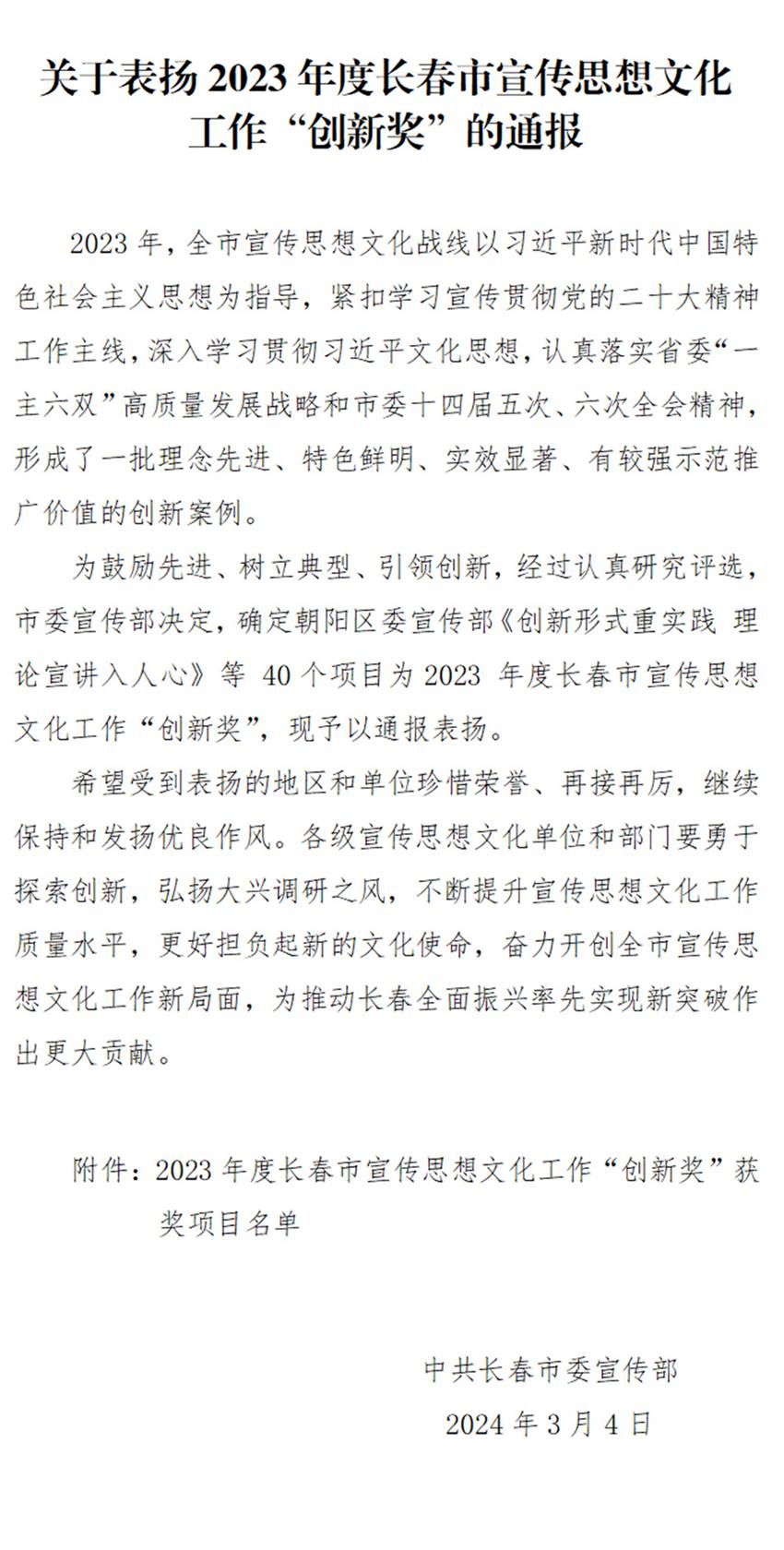 2023年度長春市宣傳思想工作“創新獎”由中共長春市委宣傳部組織評選,基于2023年度全市宣傳思想文化戰線認真學習宣傳貫徹黨的二十大精神、習近平文化思想,落實省委“一主六雙”高質量發展戰略和市委十四屆五次、六次全會精神,形成的一批理念先進、特色鮮明、實效顯著、具有較強示范推廣價值的創新案例,為鼓勵先進、樹立典型、引領創新,確定了40個項目為2023年度長春市宣傳思想工作“創新獎”。