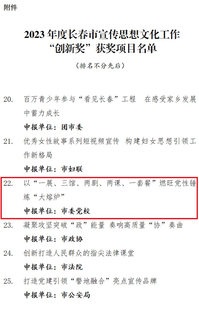 近日,中共長春市委黨校(長春市行政學院)報送的“以‘一展、三館、兩劇、兩課、一套餐’燃旺黨性錘煉‘大熔爐’”項目榮獲2023年度長春市宣傳思想文化工作“創新獎”,得到通報表揚。