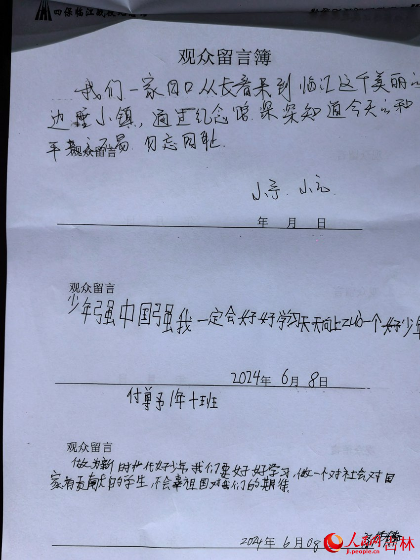 四保臨江戰役紀念館內還有一個很用心的舉措:擺放著觀眾留言簿,讓來到這里緬懷先烈的人有了心靈寄托?!吧倌陱娭袊鴱?,我一定會好好學習天天向上,做一個好少年?!痹诹粞圆局?,一個一年級的小朋友一筆一畫寫下了這樣一句話,用拼音代替寫下的字更是引人深思。