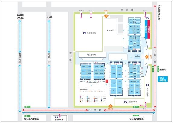 為方便廣大市民觀展,共有202、307、136三條公交專線延長了運行線路,在展館入口設置站點。展館周邊規劃設置了網約車??奎c位和5處停車場。同時,在地鐵一號線、六號線的華慶路站和博覽中心入口處,設置了擺渡車,觀眾可乘坐擺渡車往返地鐵與展館。