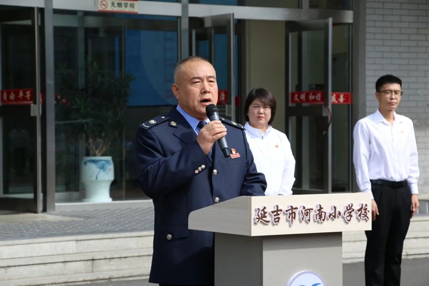 9月18日,由延吉市退役軍人事務局、共青團延吉市委員會聯合組織的“喜迎新中國成立75周年·紅色故事進校園”迎國慶升旗儀式,在河南小學舉行。共青團延邊州委副書記范例、延吉市退役軍人事務局局長王晶、全國模范退役軍人、國家稅務總局延吉市稅務局副局長王兆龍、共青團延吉市委副書記金德元、“吉行軍”退役軍人志愿者、學校師生代表3700余人參加活動。