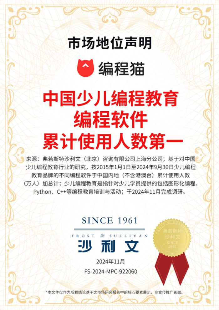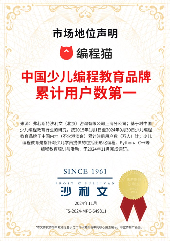 近日,全球頂尖研究及咨詢機構弗若斯特沙利文(Frost & Sullivan)授予編程貓“中國少兒編程在線教育開創者”“中國少兒編程教育品牌累計用戶數第一”“中國少兒編程教育編程軟件累計使用人數第一”三項市場地位聲明書。