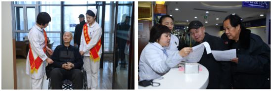 長春市中心醫院工作人員為參加體檢老兵一對一服務。