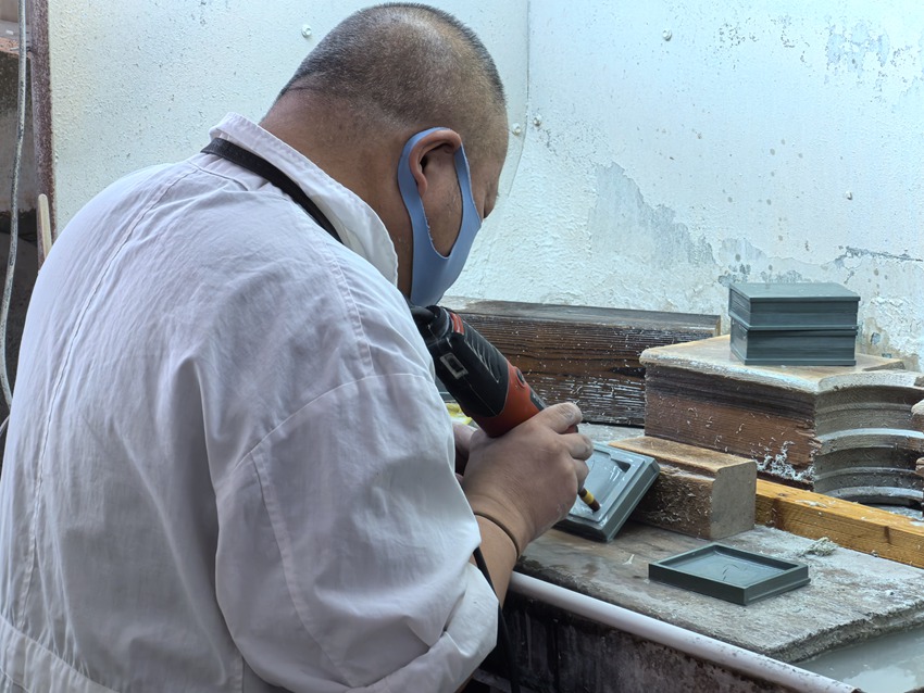 “我從小跟著家里學習木雕,2016年開始從事松花石雕刻,從硯臺開始?!蓖ɑ窦妓噦鞒腥?、松花石實訓基地負責人張新始終鉆研打磨他摯愛的松花石雕刻事業。