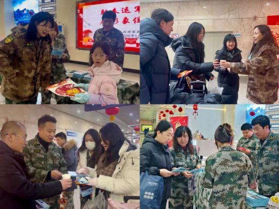 活動現場,30余名身著迷彩工作服和“紅馬甲”的軍供志愿者分為四組,在長春市火車站南北出站口、換乘大廳、自助取票口設立“愛心驛站”志愿服務臺,為來往游客和市民開展引導咨詢、秩序維護、熱飲供應、政策宣傳等志愿服務,發放春節掛飾、福字等小禮品,現場氛圍溫馨和諧。志愿者們在鐵路長春站內場地為游客指引附近公交和地鐵站點,介紹長春市文旅局制作的“長春冬季旅游圖”,大力宣傳長春市冰雪旅游。聚焦過往退役軍人,結合城開運營公司提供的宣傳電子屏,講解了退役軍人、其他優撫對象優待證在吉林省內的有關優惠政策?;顒舆€特別設立“送溫暖”環節,針對老弱病殘孕等特殊旅客群體,主動幫助搬運行李,護送行動不便的市民到達指定地點,并邀請火車站工作人員和環衛工人到服務臺休息,及時遞上冒著熱氣的紅糖姜茶,熱情提供暖心便民服務,進一步提升市民群眾的滿意度、獲得感。