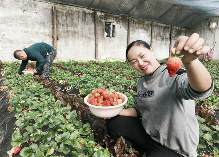 高玉靜家的大棚堪稱“高效利用典范”,除了供人行走的窄窄小徑,其余空間被果蔬填得滿滿當當。壟上草莓紅得嬌艷,壟間蔬菜綠得醉人?!斑@4座大棚,基本都是我倆忙活著,施肥、澆水、采摘……一年下來能有10多萬元的收入!你瞅瞅這大草莓,誰看了不喜歡,現在可是不愁賣!”高玉靜一邊手腳麻利地采摘著草莓,一邊滿臉笑意地分享著豐收的喜悅。