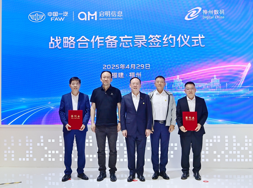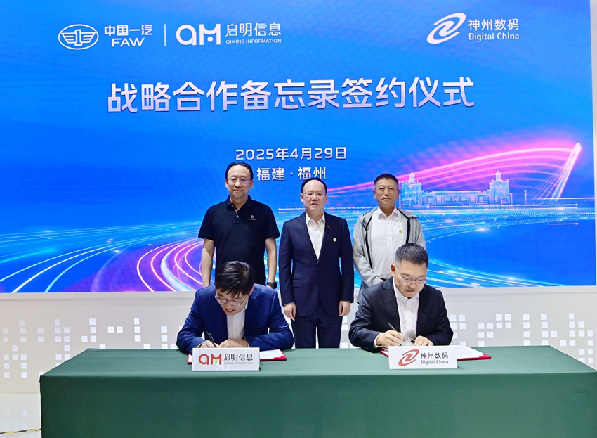 人民網福州4月29日電 (記者馬俊華)4月29日,第八屆數字中國建設峰會啟幕,在中國一汽展區現場,神州數碼集團股份有限公司(以下簡稱“神州數碼”)與中國一汽旗下啟明信息技術股份有限公司(以下簡稱“啟明信息”)簽署戰略合作備忘錄。雙方將圍繞數字化轉型、智能網聯汽車、智慧出行服務等領域展開深度合作,共同探索“汽車+科技”跨界融合的創新模式,助力中國汽車產業高質量發展。