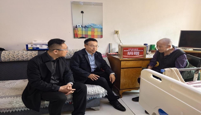 愛心企業員工與退役軍人工作者一同走進參加過抗日戰爭和抗美援朝戰爭的 95 歲老兵楊建家中,向老兵子女詳細詢問老兵身體狀況和生活情況,和老兵共同回憶軍旅生涯,表達崇高敬意,并為老兵送上慰問品。