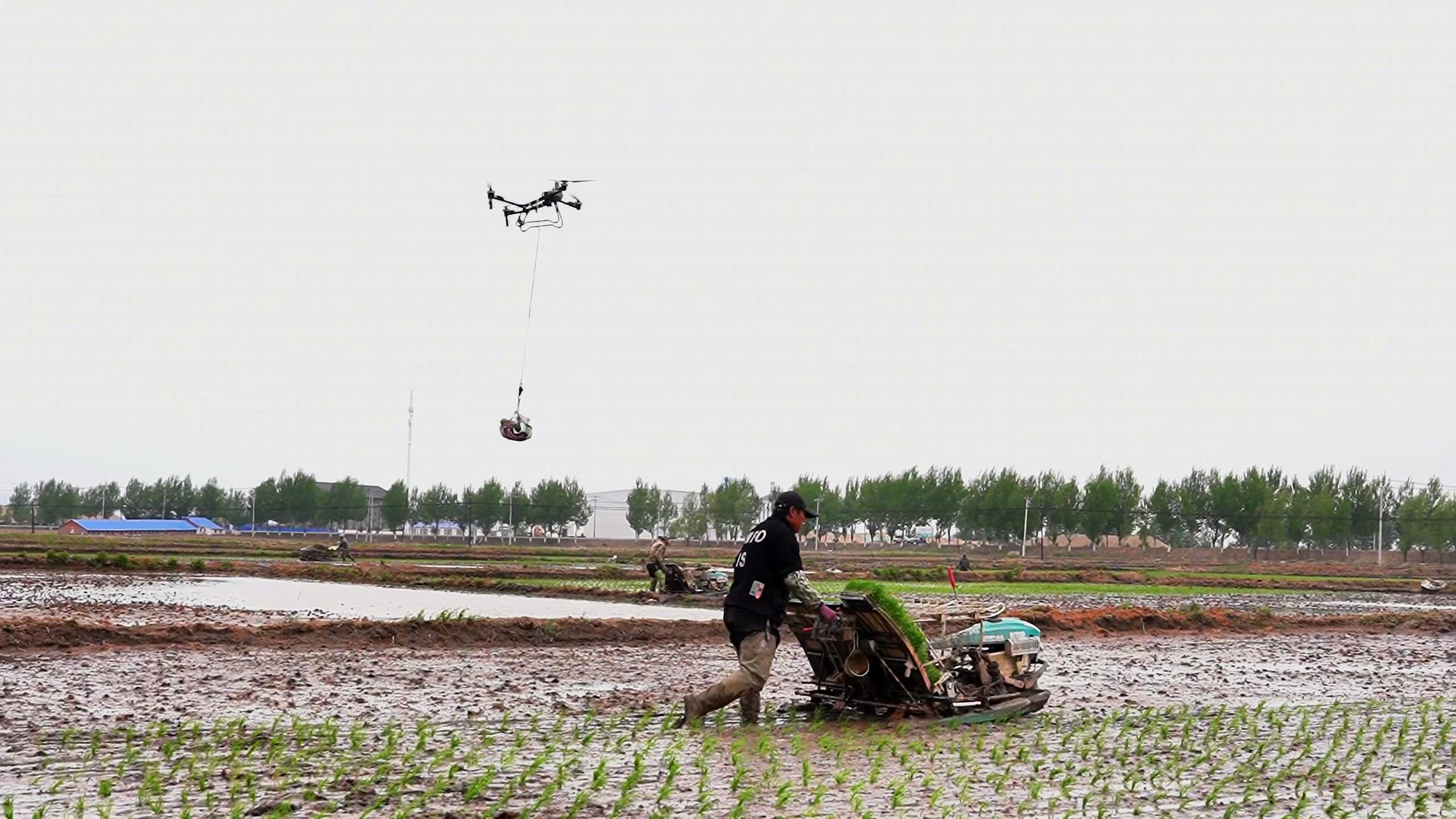 5月20日下午,吉林省舒蘭市溪河鎮舒蘭站村農豐水稻種植合作社的千畝稻田春耕正忙,插秧機在水田中行進,蕩起陣陣漣漪,好一幅春耕畫卷。轟鳴聲中,兩臺無人機在稻田上方往來穿梭,以一次5盤的頻率將秧苗從田邊貨車精準運送到插秧機操作臺上。