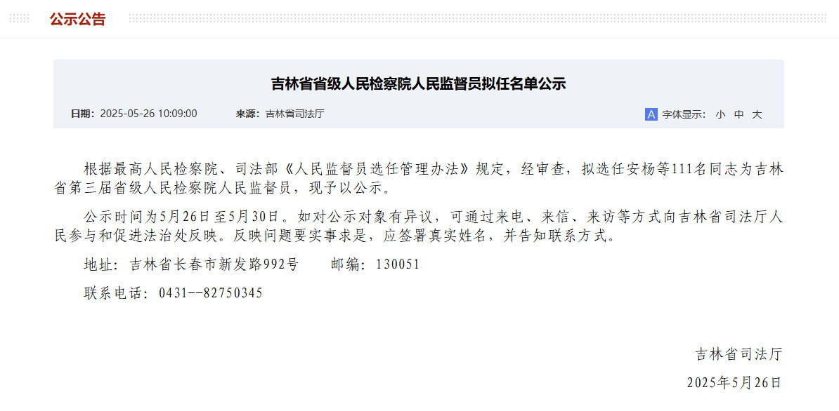 人民網長春5月26日電 據吉林省司法廳網站消息,吉林省根據最高人民檢察院、司法部《人民監督員選任管理辦法》規定,經審查,擬選任安楊等111名同志為吉林省第三屆省級人民檢察院人民監督員,現予以公示,公示時間為5月26日至5月30日。